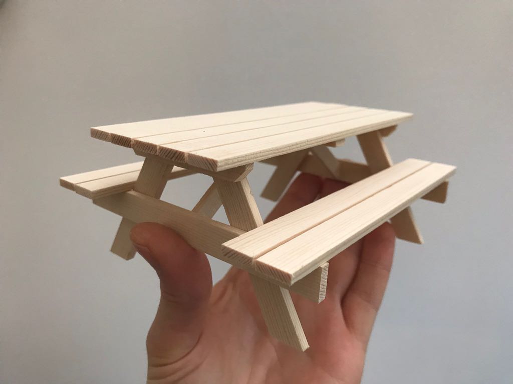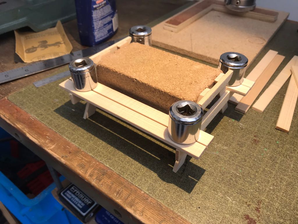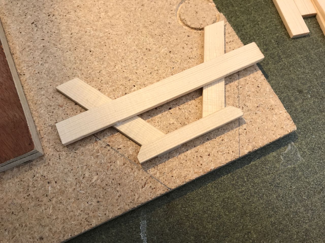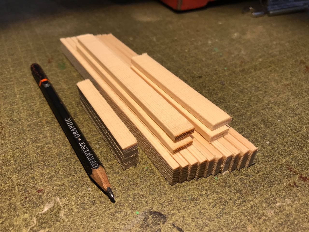 Materials cut from Pine on the bandsaw. Pencil for scale.