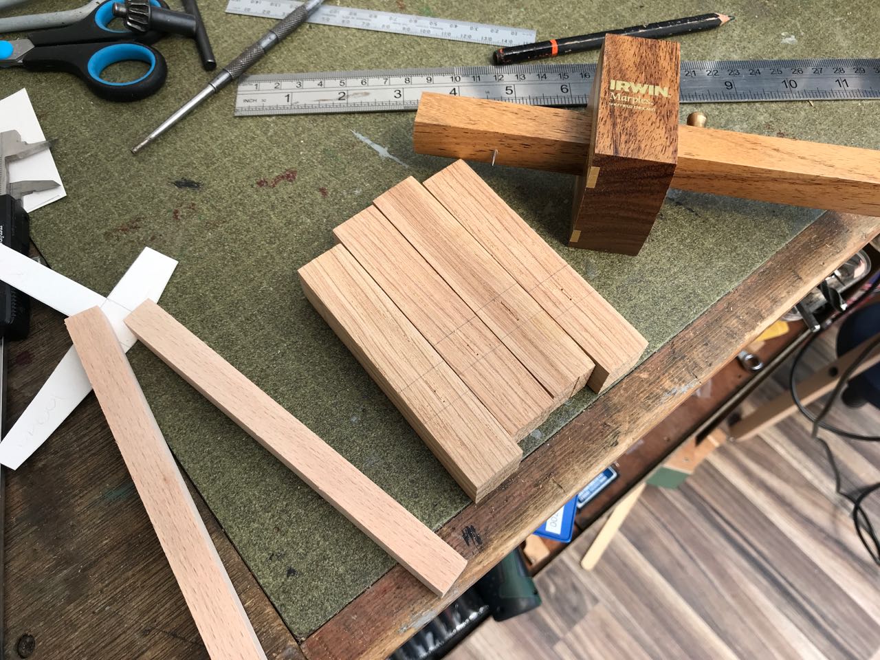 I used off cuts of Red Oak left over from a tripod lamp and Beech left over from a chopping board cut to size on my bandsaw.