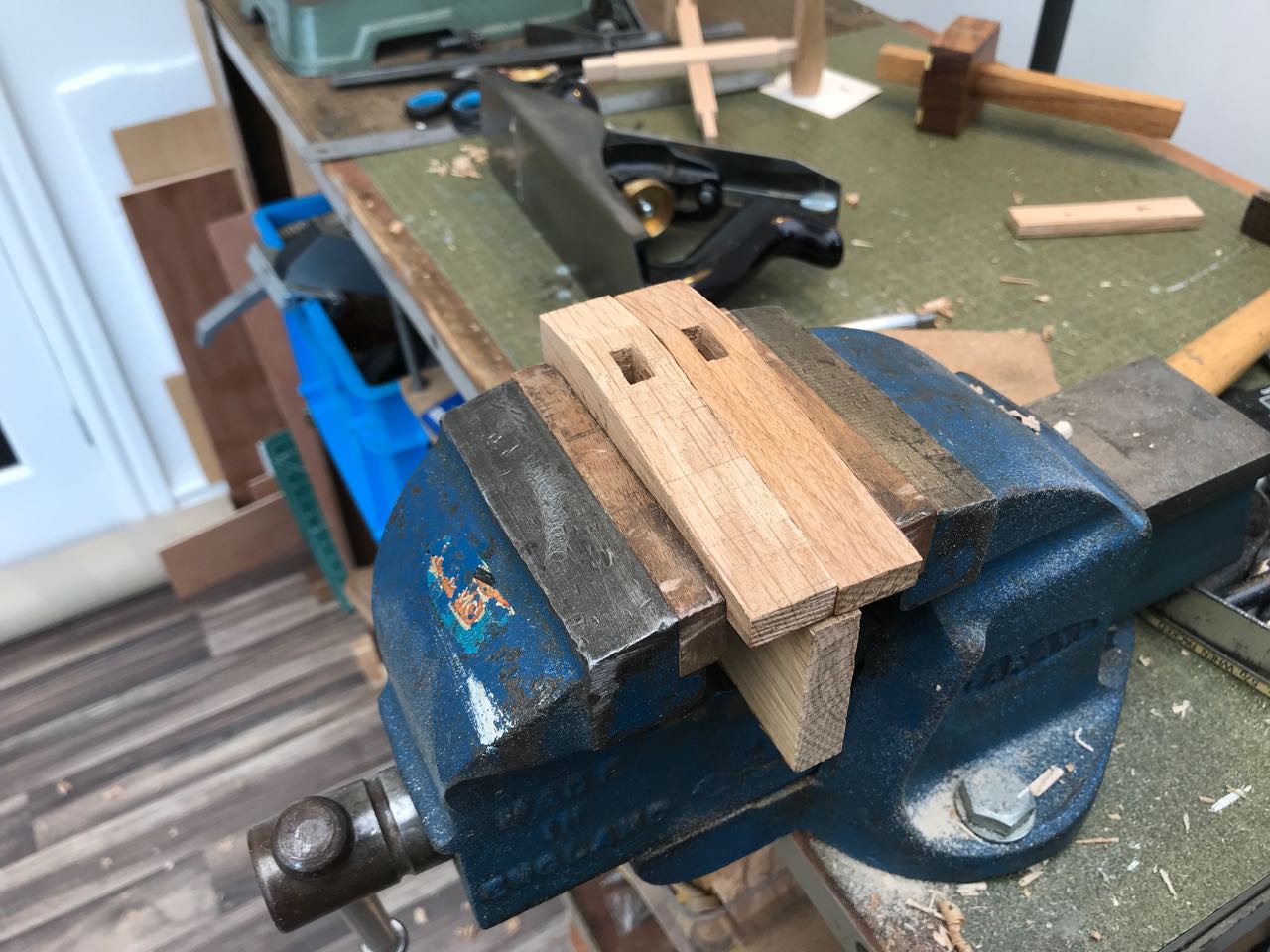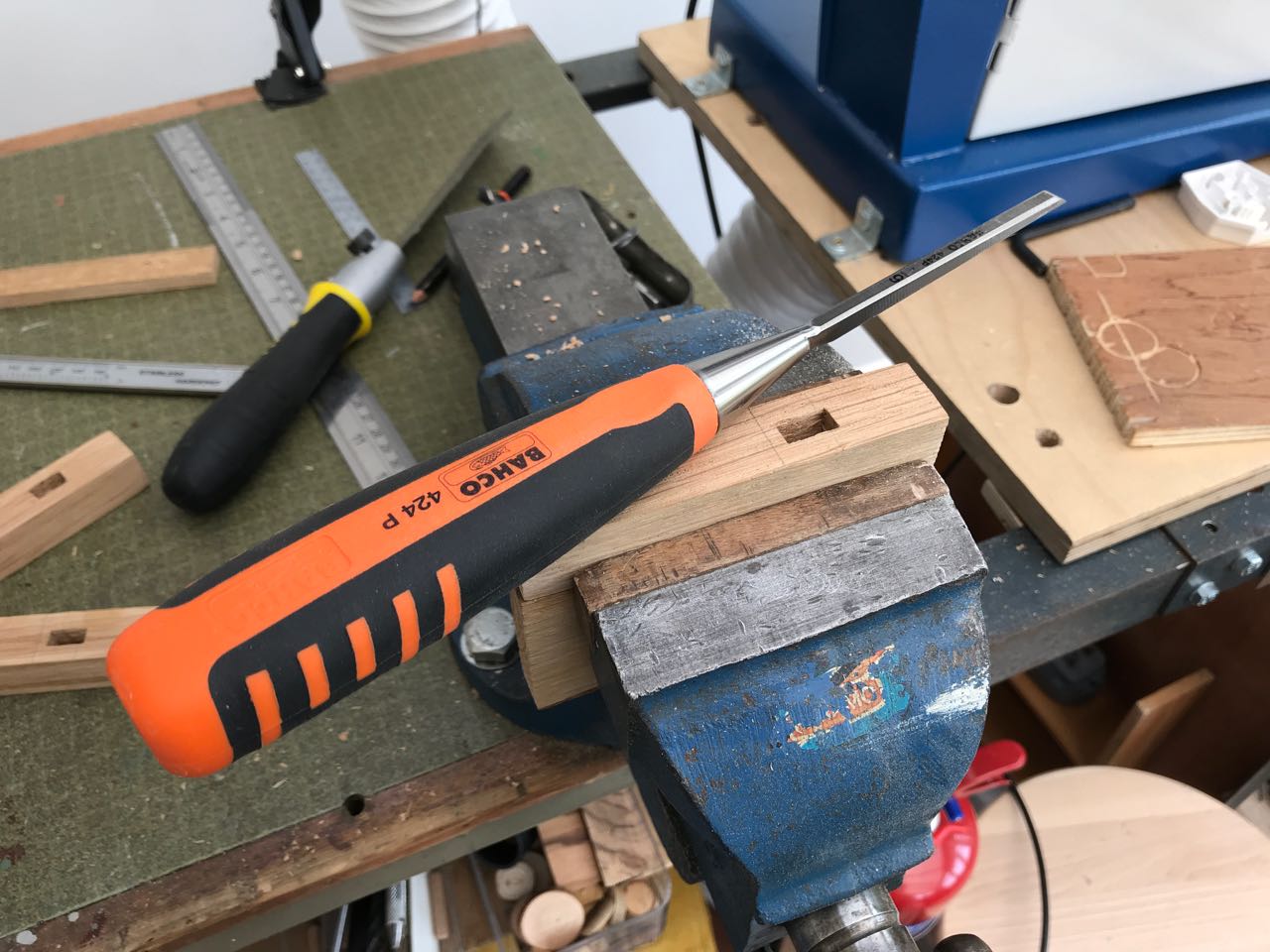 Finishing the mortices with a 6mm chisel, a scrap block placed under the leg prevent splitting of the otherside of the mortices.