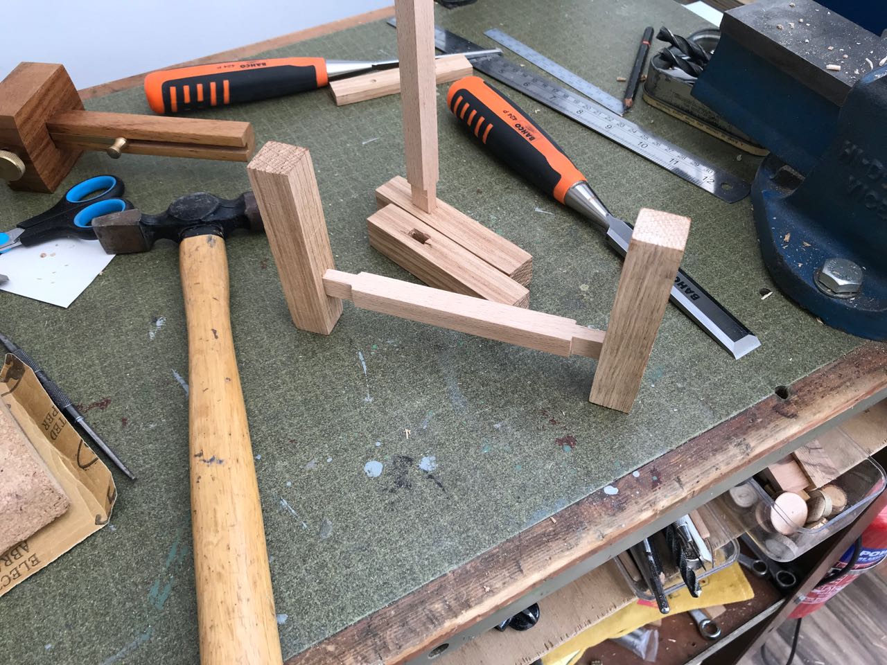 I had sanded each part to the desired finish and used two clamps to force each pair of legs home in turn. The friction fit of each joint was sufficient to hold it in place even without wedges but I used a small spot of wood glue on each joint to secure it.