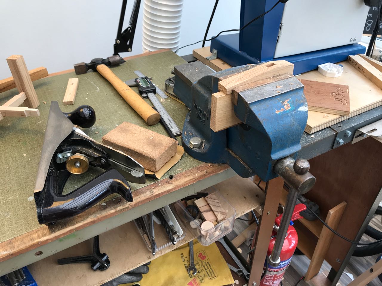 The first leg was used as a template to plane the final profile of the other three legs, again a scrap block in the vice ensures correct alignment.